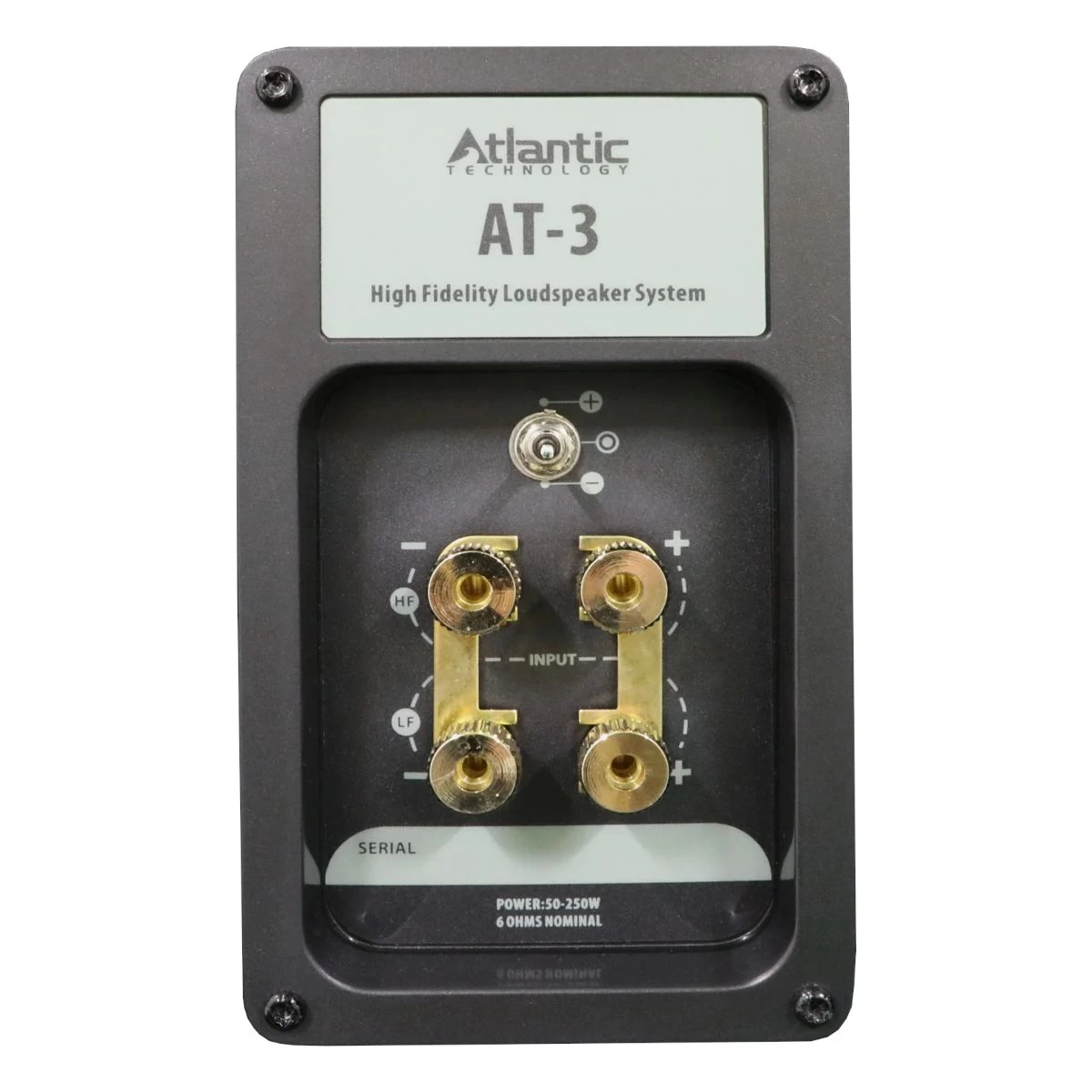 The back panel has a three-position switch to change the relative output level of the tweeter to compensate for different room acoustics and personal taste. The +/- positions subtly adjust the tweeter output by very slight amounts over its operating range from 2 kHz to 20 kHz. These positions change the speaker’s spectral balance by adjusting the proportion of treble to bass over a wide frequency band.