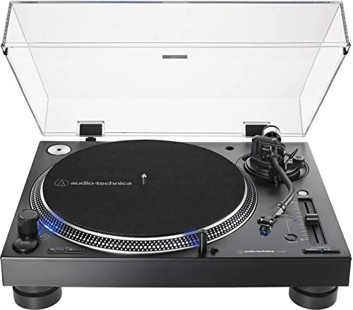 The AT-LP140XP fully manual professional DJ turntable features a high-torque direct-drive motor and anti-resonant, mass-damped, die-cast aluminum platter to ensure stable, on-axis rotation at 33-1/3, 45, and 78 RPM. It is equipped with an S-shaped tonearm with height adjustment, adjustable tracking force (counterweight) and adjustable dynamic anti-skate control.