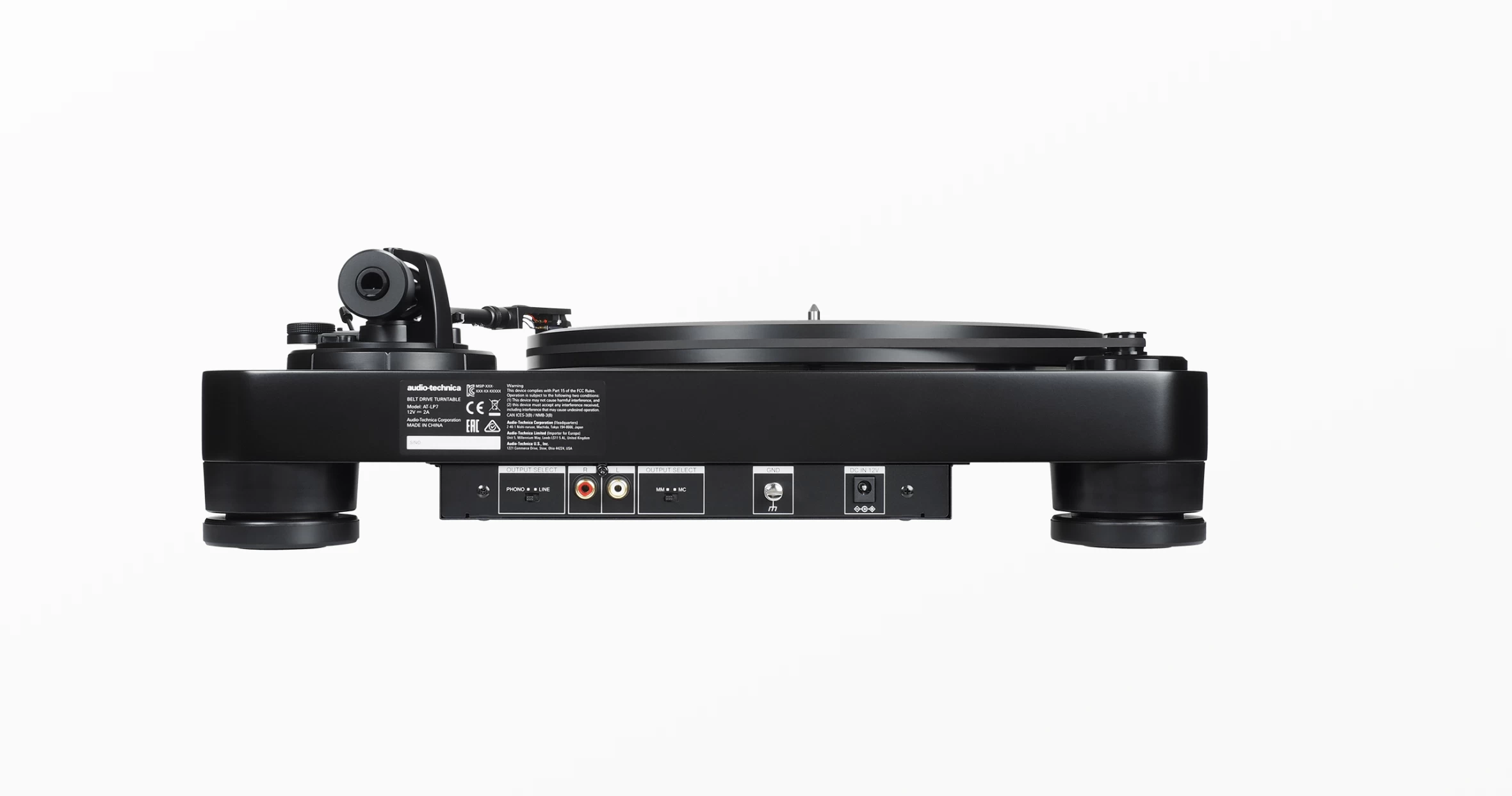 The turntable chassis is constructed of 40 mm-thick MDF (medium density fiberboard), an excellent anti-vibration damping material that limits low-frequency acoustical feedback. The anti-resonance platter is made of 20 mm-thick polyoxymethylene and is driven by a sensor-monitored motor that ensures a continuously accurate platter rotation speed of 33-1/3 or 45 RPM. The AT-LP7 also includes a built-in switchable phono/line preamp for connection to components with or without a dedicated phono input, and a selector switch to designate operation with a moving magnet or moving coil cartridge.