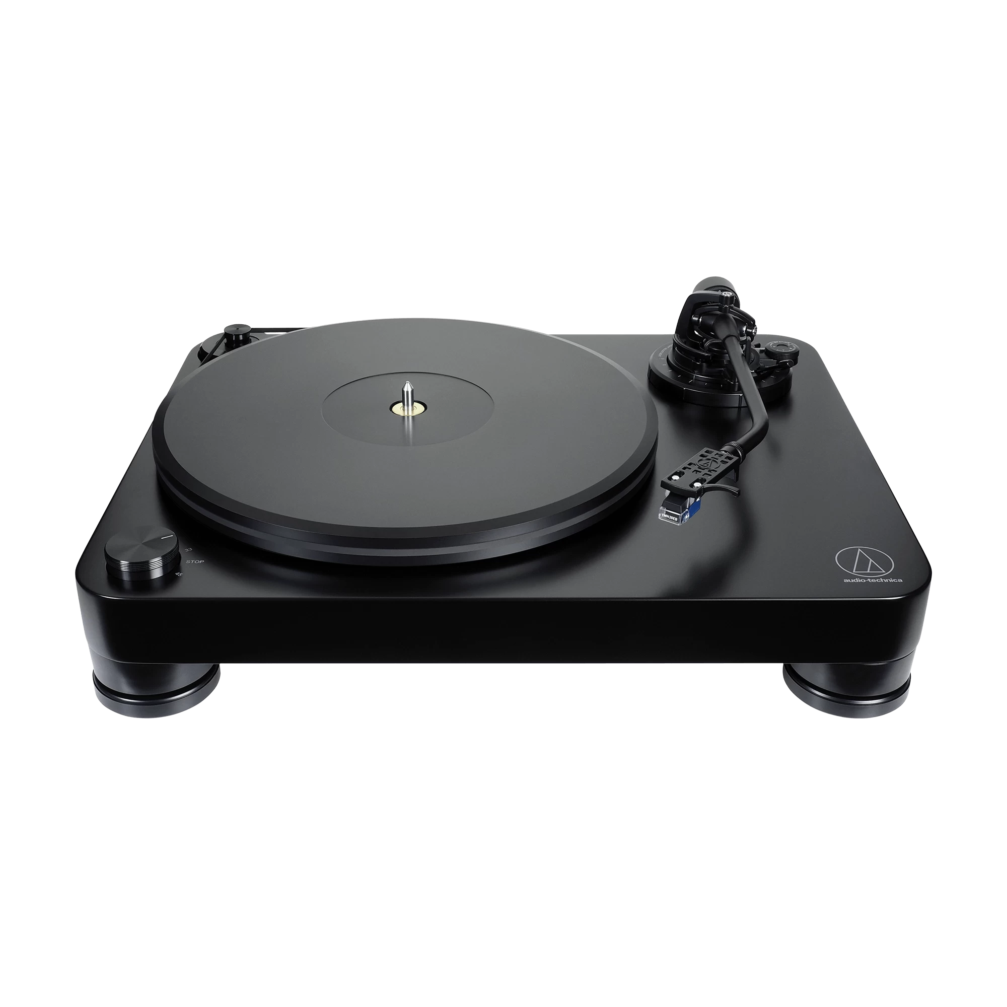 The headshell attaches to a J-shaped tone arm that takes its inspiration from the classic A-T models of the 1960s and ’70s. The tone arm features a metallic gimbal suspension system and precision bearings to mitigate tracking errors, and includes an adjustable counterweight and anti-skate control. The height of the tone arm can be adjusted from 0 mm to 6 mm to accommodate a wide variety of cartridges.
