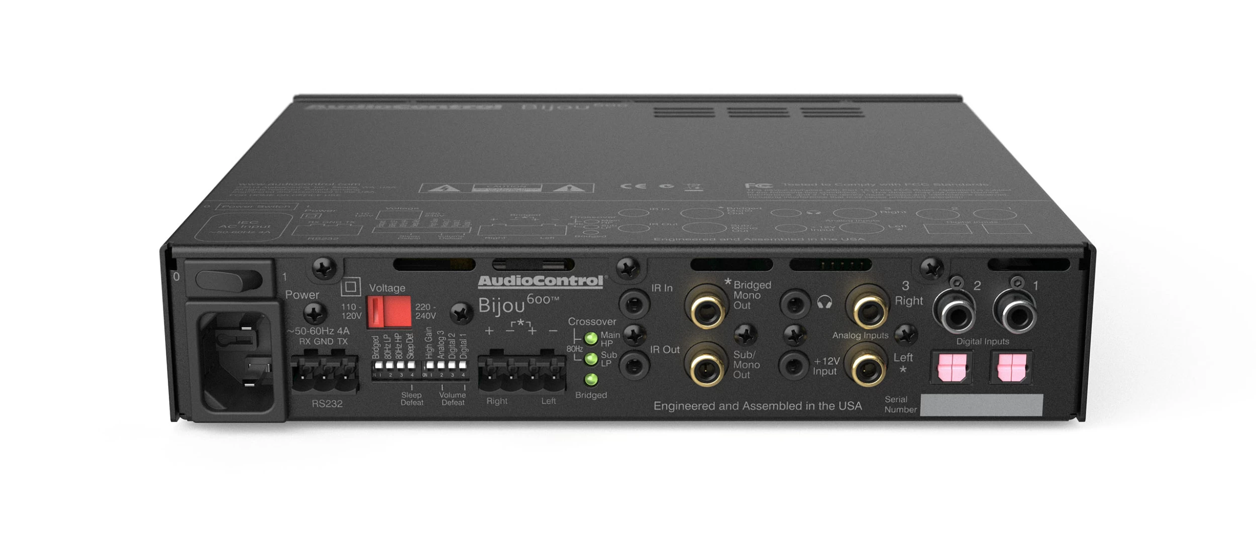 The Bijou 600 includes a myriad of powerful features including switchable inputs (including analog, digital COAX, digital Optical), combined with variable volume control circuitry controllable via discrete IR or discrete RS232 commands. The Bijou 600 delivers 2 x 100 watts of power at 8 Ohms, 200 watts at 4 Ohms and can also act as a 400-watt mono-block and operates stable down to 3.6 Ohms.