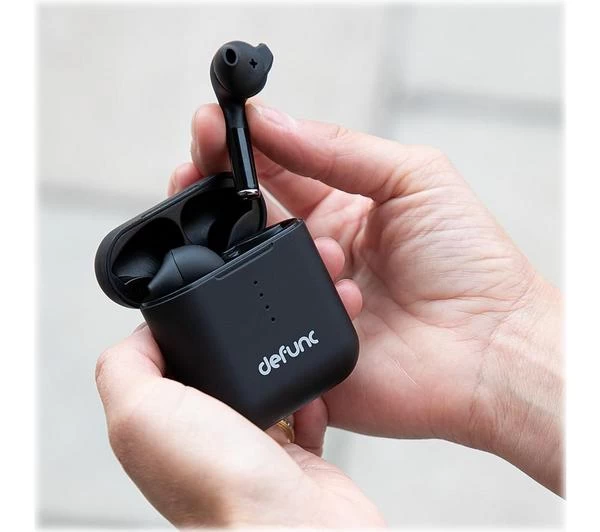 Enjoy your music without getting tangled in wires with the Defunc True Go Wireless Bluetooth Earphones. They have powerful and clear sound and their ear-tip design ensures a great fit and comfort – all without a wire in sight.