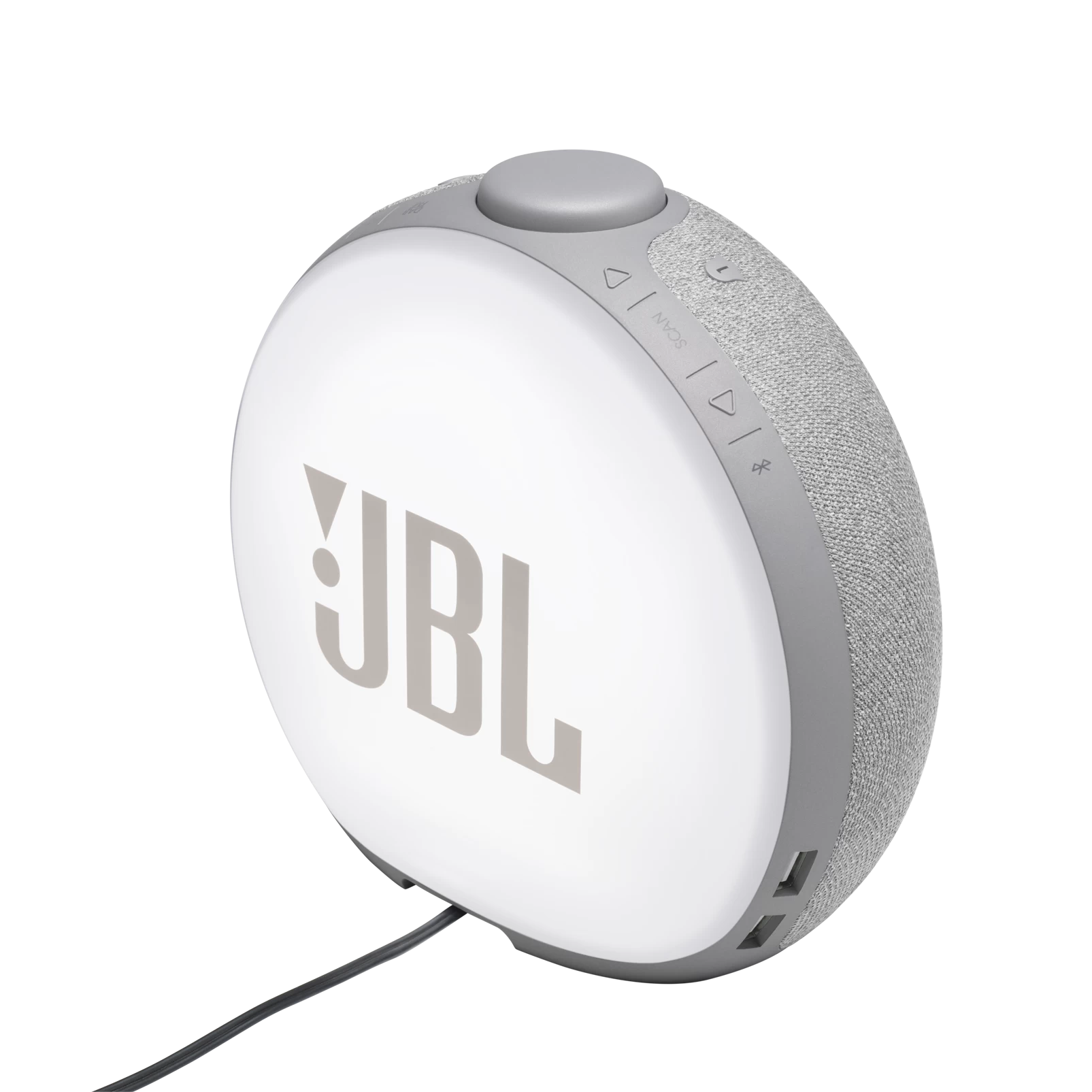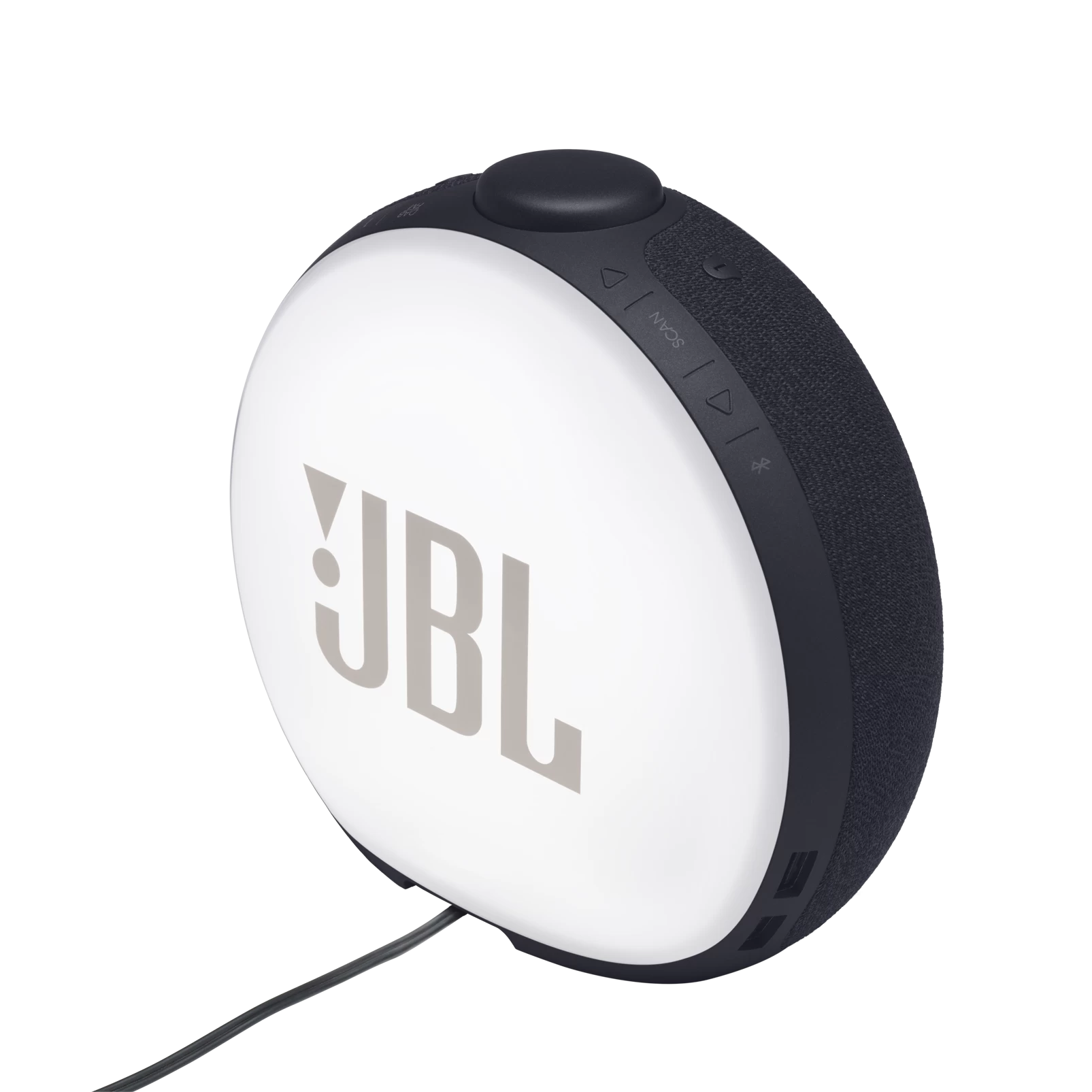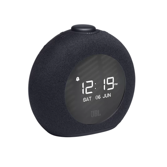 Wake up to JBL Pro Sound. With its signature round design, ambient LED light and FM radio, JBL Horizon 2 completes any bedroom. A large LCD display clearly shows the time, alarm settings and radio info, while the lifestyle fabric cover blends perfectly with any decor. Choose from a selection of alarm tones or one of your favorite FM radio stations. The easy-to-use rotary control knob lets you set and snooze alarms, adjust the volume or turn the ambient light on and off. Complete with two convenient USB ports for charging your devices, JBL Horizon 2 is the perfect bedside companion.