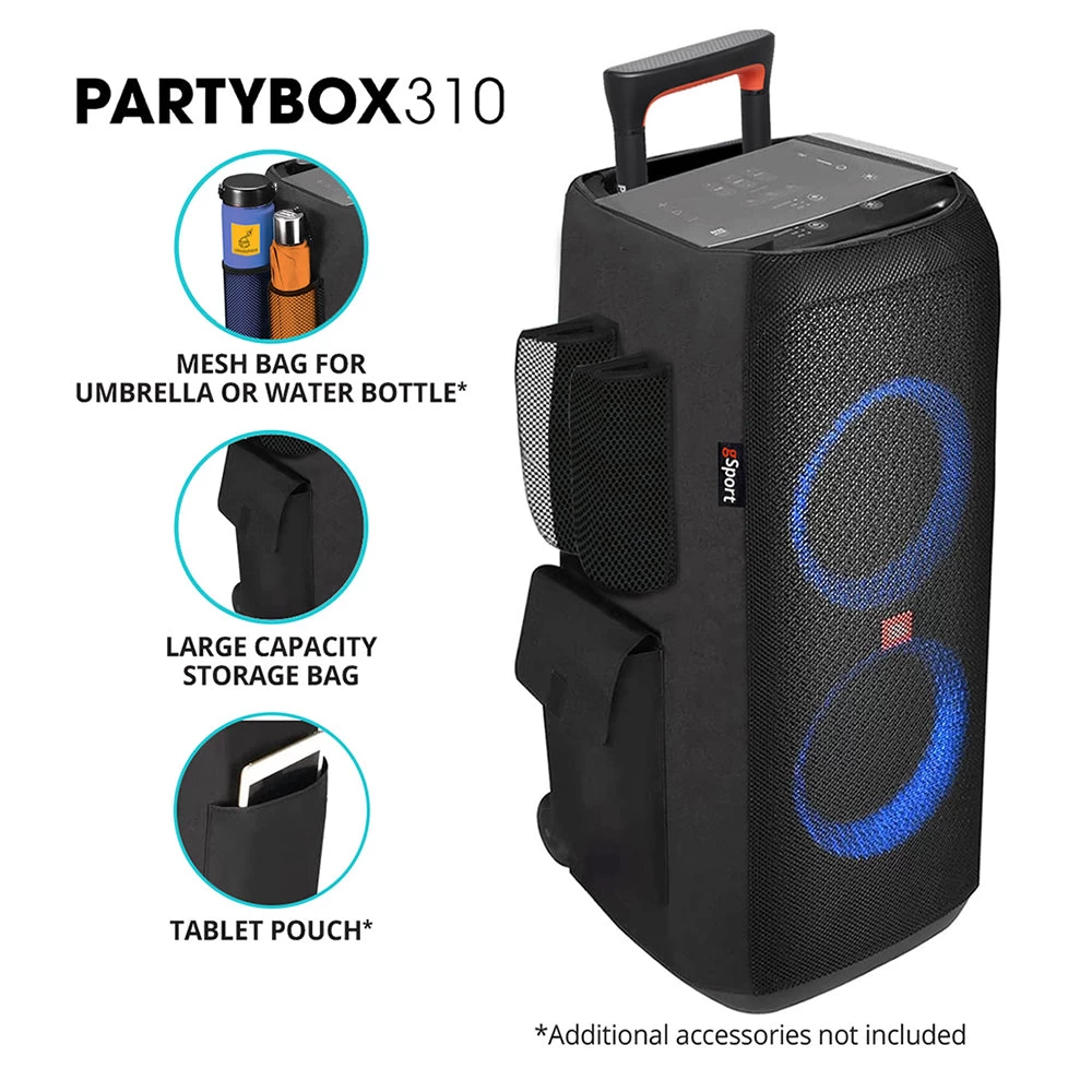Huge sound, dazzling lights and unbelievable power set this speaker apart from the crowd. The JBL PartyBox 310 packs a full party into a transportable, splashproof sound machine like no other. Turn up your favorite playlists anywhere, from get-togethers at home to dance parties on the beach. Bring big party vibes with 240 watts of JBL Pro Sound and a synced light show that grooves to the beat. Plug in and keep the fun going all night or wheel over to the campfire and take advantage of its impressive 18-hour battery life. Start a party with the JBL PartyBox 310.