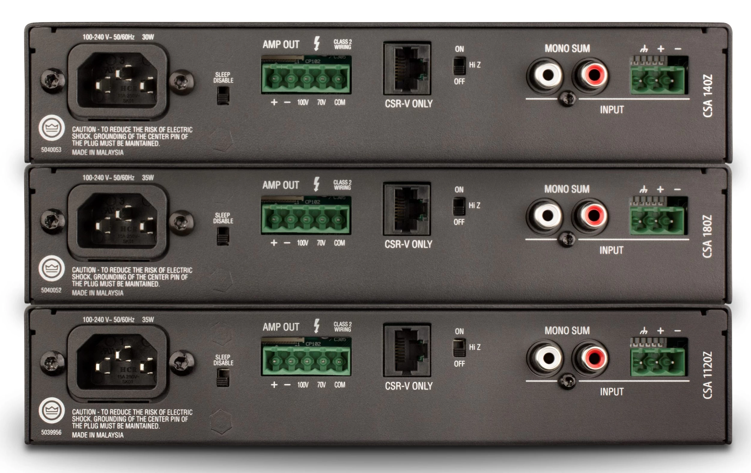 Supporting 70V and 100V installations out of the box, Commercial Series amps include RJ45 connectors for use with JBL CSR-V in-wall volume controls. Its universal power supply allows every Commercial Series amp to accept AC voltages from 100 to 240 VAC, 50/60 Hz.