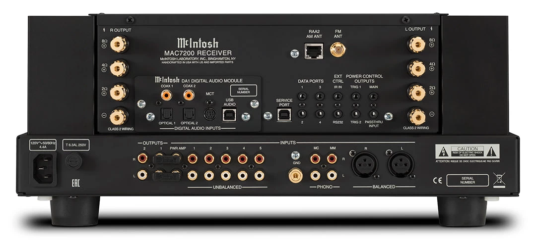 The digital inputs are contained in McIntosh’s DA1 Digital Audio Module; DA1 can be replaced by future modules to easily keep MAC7200 up to date with the latest digital audio technologies. At the heart of DA1 is a powerful 8-channel, 32-bit Digital-to-Analog Converter (DAC) used in Quad Balanced mode. PCM signals up to 32-bit/384kHz can be played via the USB input, allowing for playback of high resolution audio up to DSD256 and DXD 384kHz levels. The coax and optical inputs support up to 24-bit/192kHz files.