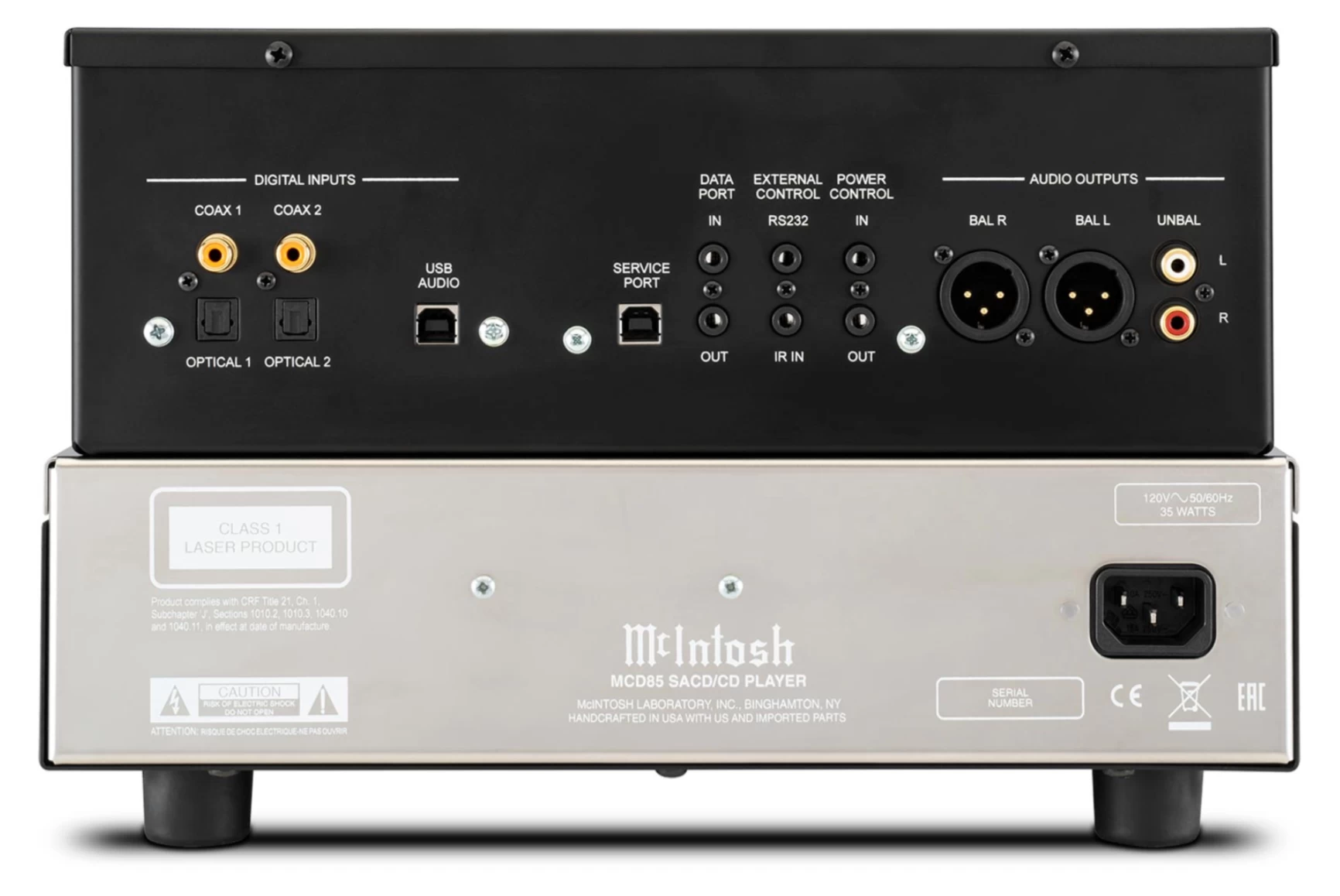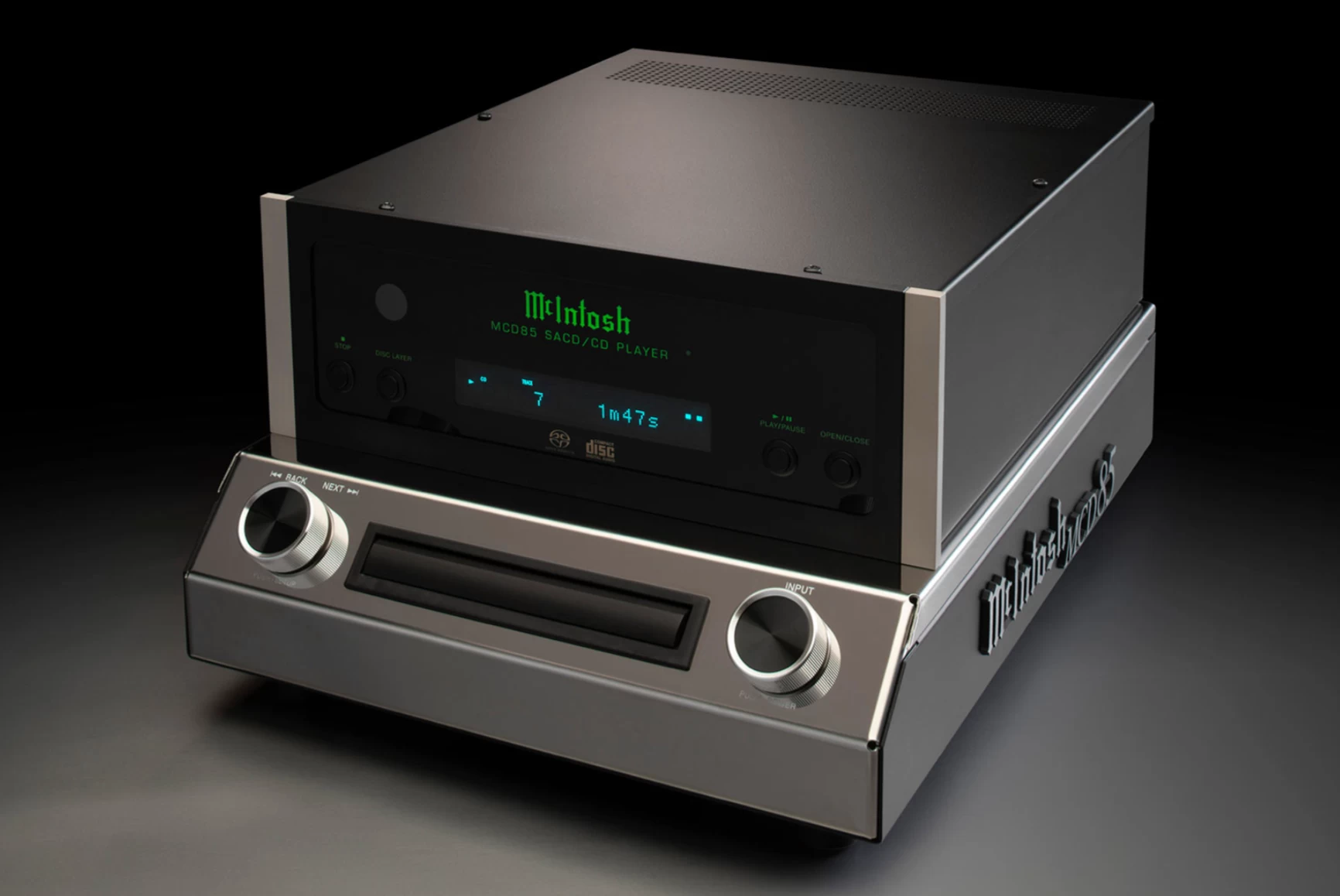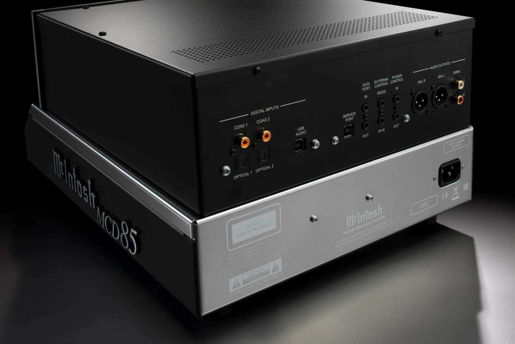 The MCD85 employs 2x read speed, meaning all discs placed in its sturdy die-cast tray are read at higher speeds, allowing their data to be stored in a buffer memory for better error correction and tracking. The tray features a new, custom front beveled nose to match the angle of the chassis and provides smooth and quiet disc handling. Disc reading is performed in the high-quality disc mechanism by a twin laser optical pickup that uses a single objective lens with two laser units, with each employing different wavelengths that are optimized for SACD and CD playback. Power Control and data ports allow for seamless integration with other McIntosh home audio system components.