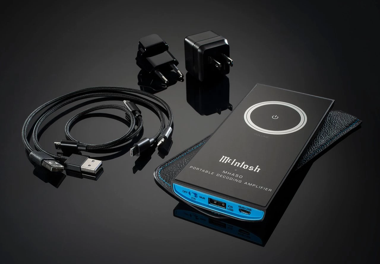 Comparably sized to smartphones, MHA50 is compact and lightweight for easy portability with a beveled case that fits comfortably in your hand or pocket. Its sleek design features a glass front panel with a touch sensitive volume control knob inspired by the classic knobs found on countless McIntosh products. It’s built primarily from durable extruded aluminum, which also has some inherent noise-shielding properties to help block external interference. Two gain settings allow MHA50 to work with all types of headphones—from small in-ear models to large over-ear studio type designs like the McIntosh MHP1000 Headphones (sold separately); it can drive headphones with impedances ranging from 8-600 ohms. Headphone Crossfeed Director (HXD®) brings added dimension to your music in a natural sounding way and can be easily turned on and off depending on your preferences. All audio is output via a gold-plated 3.5mm jack. This jack can also connect to a pair of powered desktop speakers, allowing MHA50 to serve as a desktop DAC. MHA50 comes complete with three USB adapter cables to connect various devices, a leather carrying case, and a wall mount charger with USA plug and adapters for Europe and Japan.