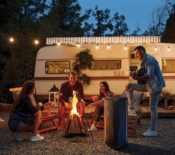 Need some calm lo-fi beats for your garden party? Or pumping bass tracks to get the dance floor moving? The MX-ST50B can fill any venue with rich and bassy sound. Thanks to its Bi-directional Sound output no corner will be left out of the fun. It can run for up to 18 hours on the built-in battery, so you can party off the grid. And with IPX5 water resistance, not even rain can stop you.