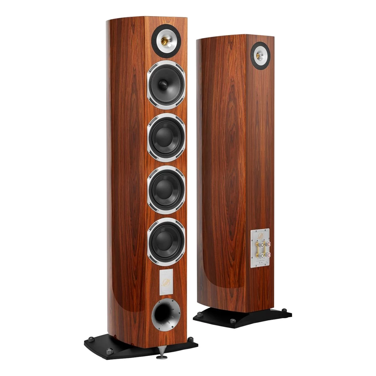 - Features a three-way design with three bass drivers, a mid-range driver, a horn-loaded tweeter, and a rear tweeter