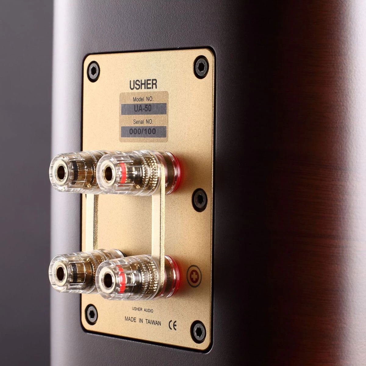 Since its founding in 1972, USHER has continuously upheld the spirit and original intention of producing the highest quality audio products. Over the past fifty years, they have accumulated profound expertise in loudspeaker technology. Whether it’s the design and planning of speaker systems, the development and selection of individual drivers, or the design of crossover networks and the construction of speaker cabinets, USHER has consistently delivered superb sound quality and elegant aesthetics. USHER possesses the capability of independently researching and producing complete loudspeaker systems, and their products have garnered high praise from professional media and audio enthusiasts worldwide. The UA-50 speaker is a special development to commemorate USHER’s fiftieth anniversary. It features the challenging craftsmanship of curved wooden cabinet construction, employing a three-way bass reflex design to achieve a wider soundstage in a medium-sized bookshelf speaker. The drivers also include USHER’s long-refined DMD diamond tweeter and composite fiber mid-bass driver, forming the foundation for excellent sound quality. The precisely designed crossover network incorporates carefully selected high-performance capacitors and air-core inductors to achieve uncompromising sonic performance.